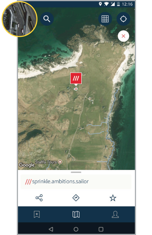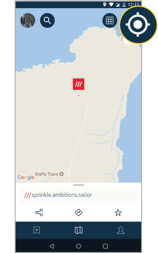 Open the what3words app and tap the ‘locate me’ icon to see your current location, or tap the ‘search’ icon and enter a street address or place, e.g., ‘Tobermory’.